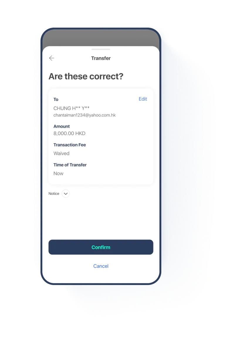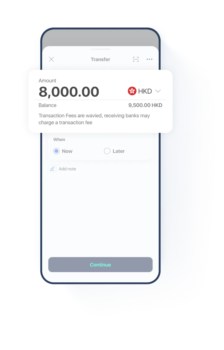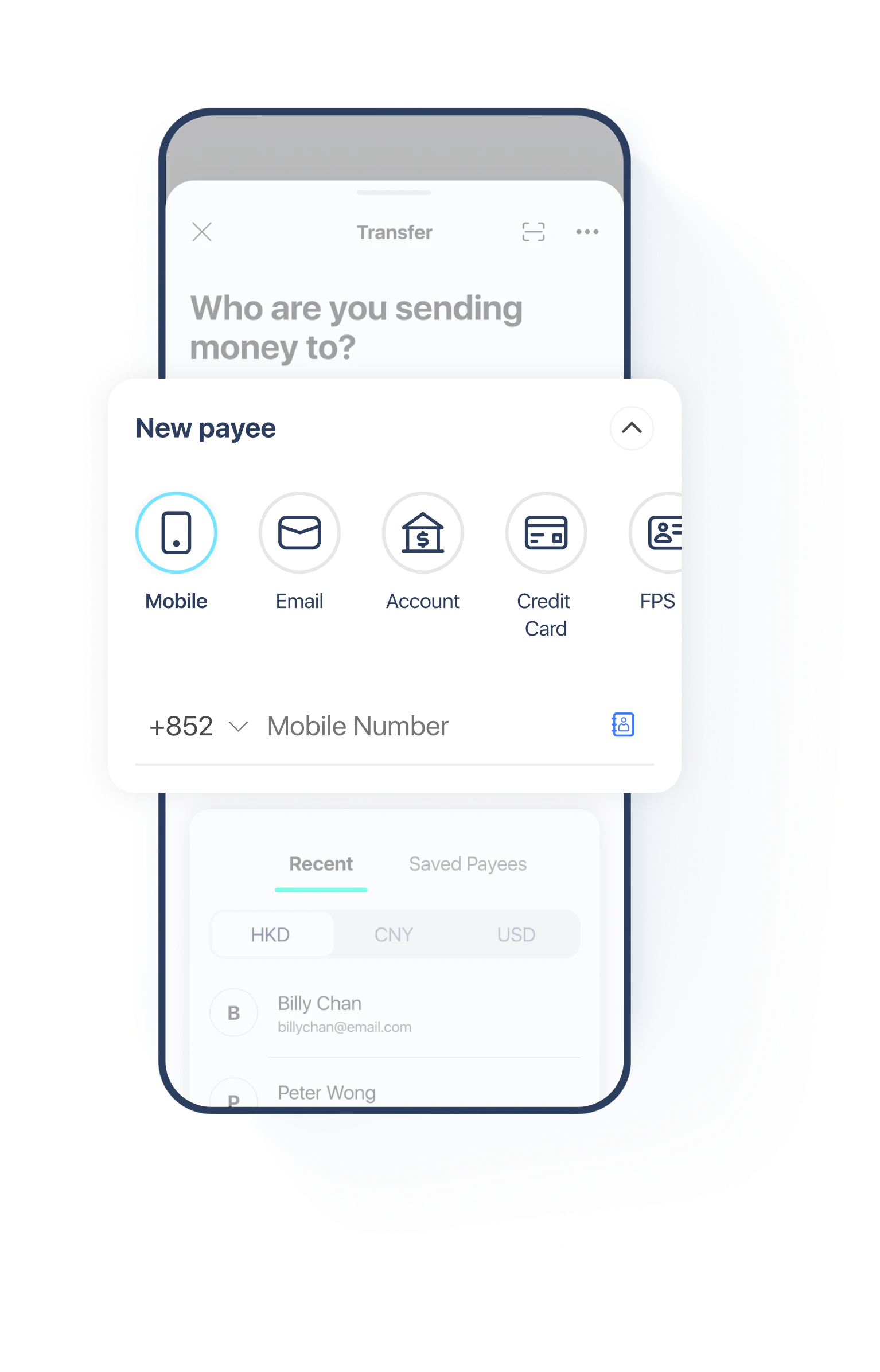Send money in HKD, CNY & USD from your account with just a few taps on your screen.