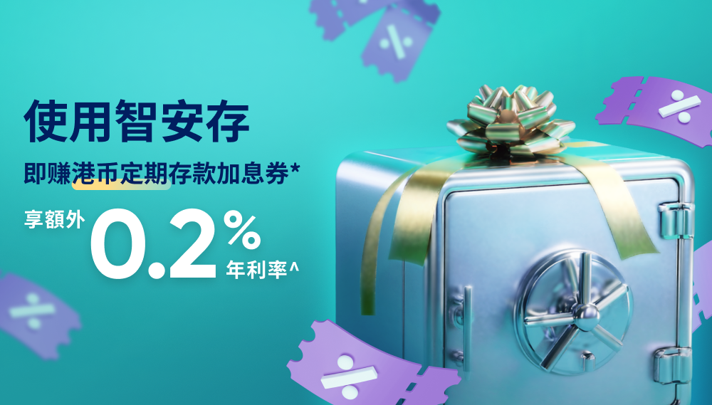 现在使用智安存更可享限时奖赏*!由即日至 2026 年 3 月 31 日,锁定活期或定期存款户口内任何货币的资金至智安存,可获得 3 个月港币定期存款加息券,享额外0.2%年利率^!